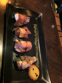 This dish, in a word was, WOW! . Looking over the menu, our eyes were drawn to our next dish. HEIRLOOM TOMATO & BURRATA CHEESE. This dish did not look like what we expected. Our eyes darted with excitement when we saw the Heirloom Tomato, Burrata Cheese, Arugula Pesto wrapped in prosciutto and topped with rich