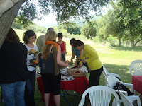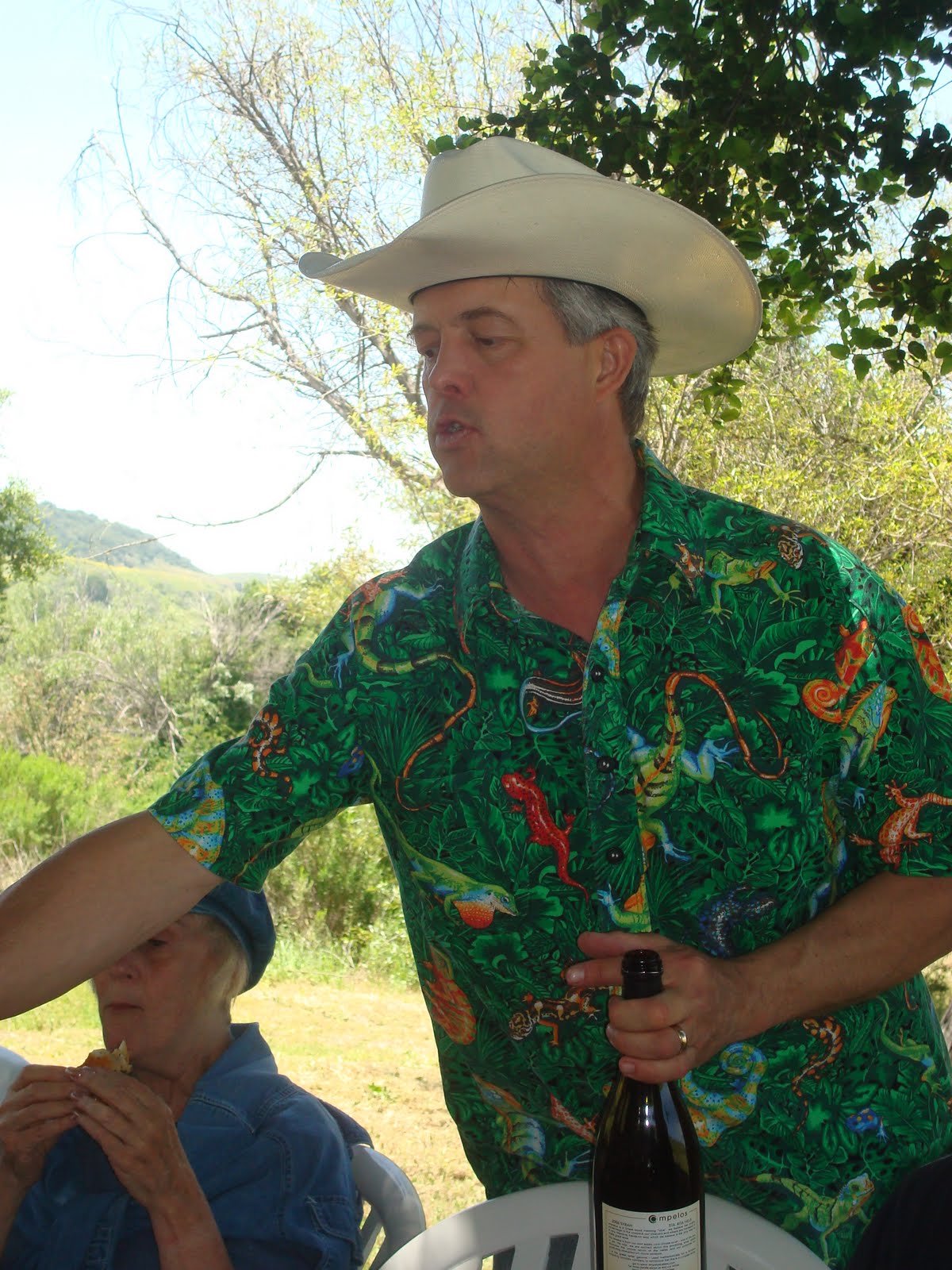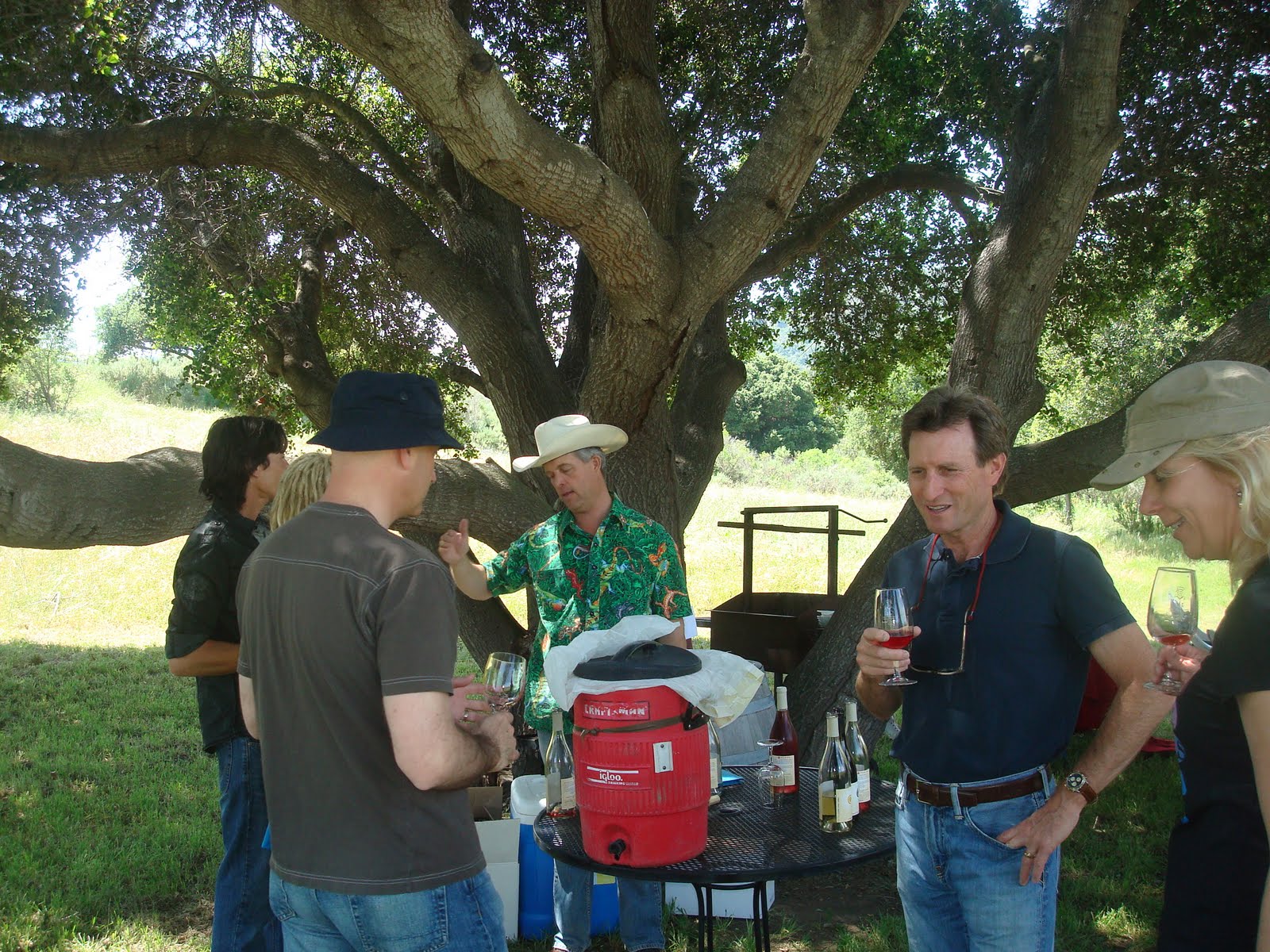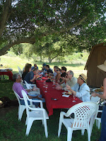 After learning about the hands on work that Peter and Rebecca put into every aspect of their vineyard it was now time to find some cool shade , have some lunch and try some of these award wining wines . With the vineyard dogs guiding the way we found the perfect place right in the middle of the vineyard.